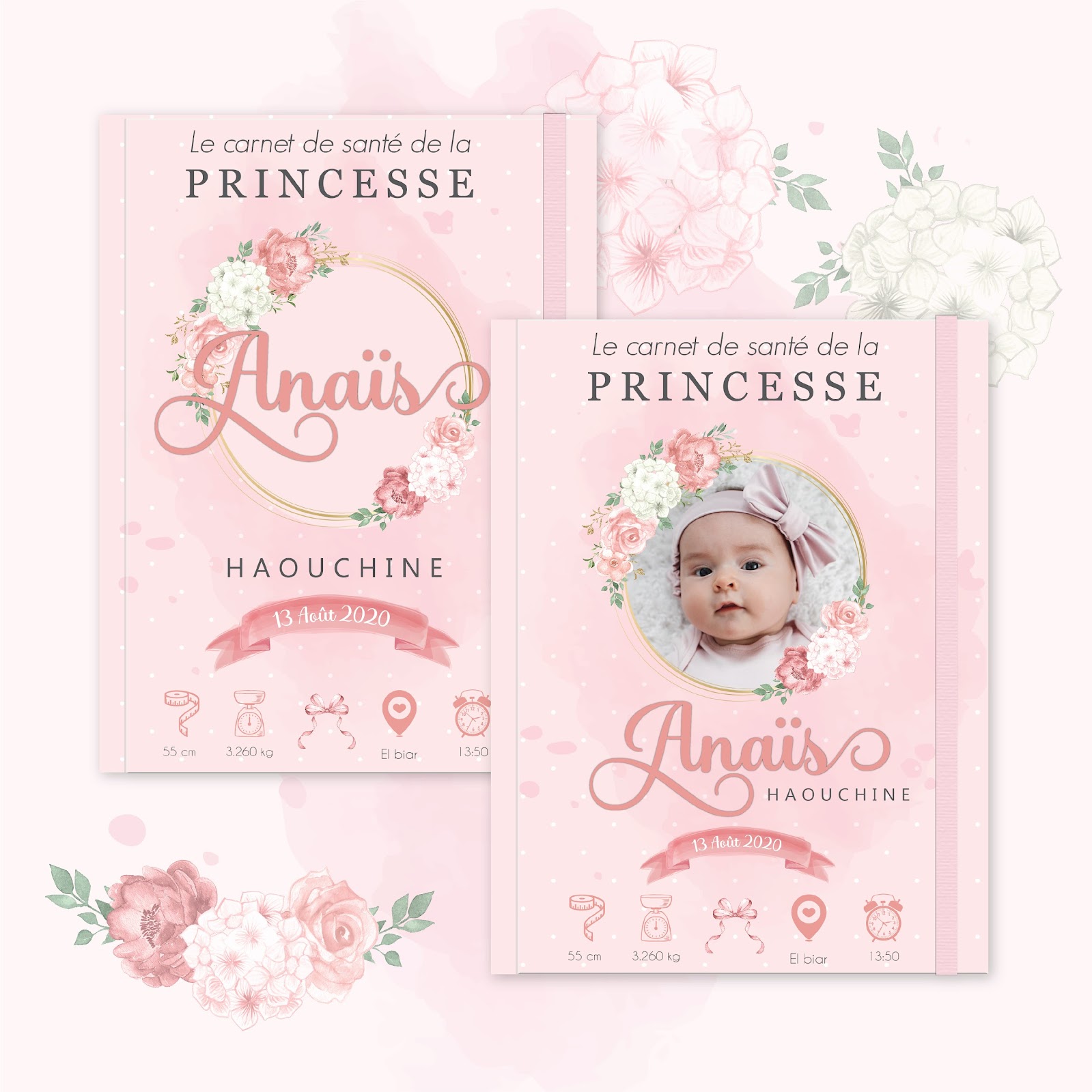 Un design tendre et raffiné, sublimé par de magnifiques fleurs d’hortensia mêlées à de délicates roses sur un fond rose pastel doux et poudré. Personnalisable avec la photo et les informations de naissance, cette couverture poétique protège le carnet de santé tout en célébrant la douceur et la grâce de votre petite princesse.